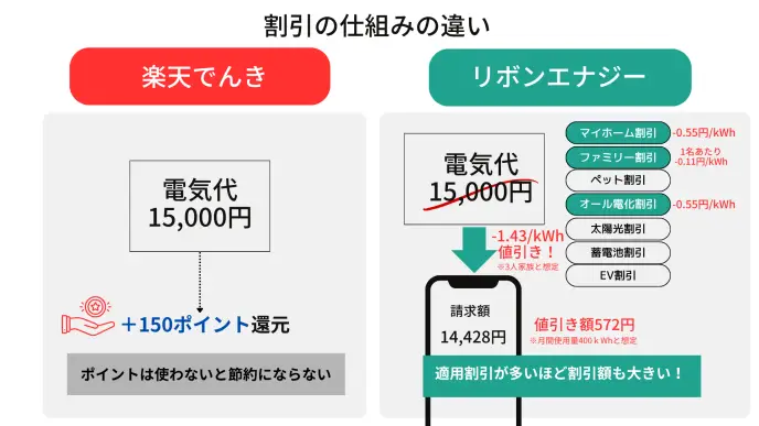 楽天でんきの還元 | リボンエナジーの割引 | 割引の差額を比較すると... | |